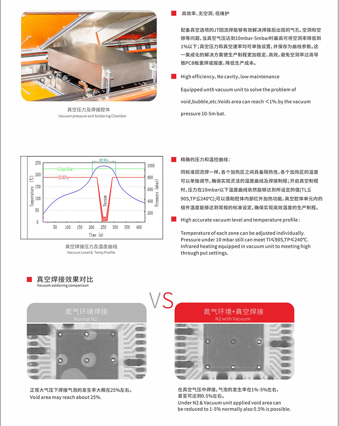 在線式真空回流焊可實現真空焊接的自動化規模量產,降低生產成本; 內置式真空模組,可分段抽取真空,空洞率降低至1%以下; 可直接移置普通回流焊溫度曲線,方便可調。