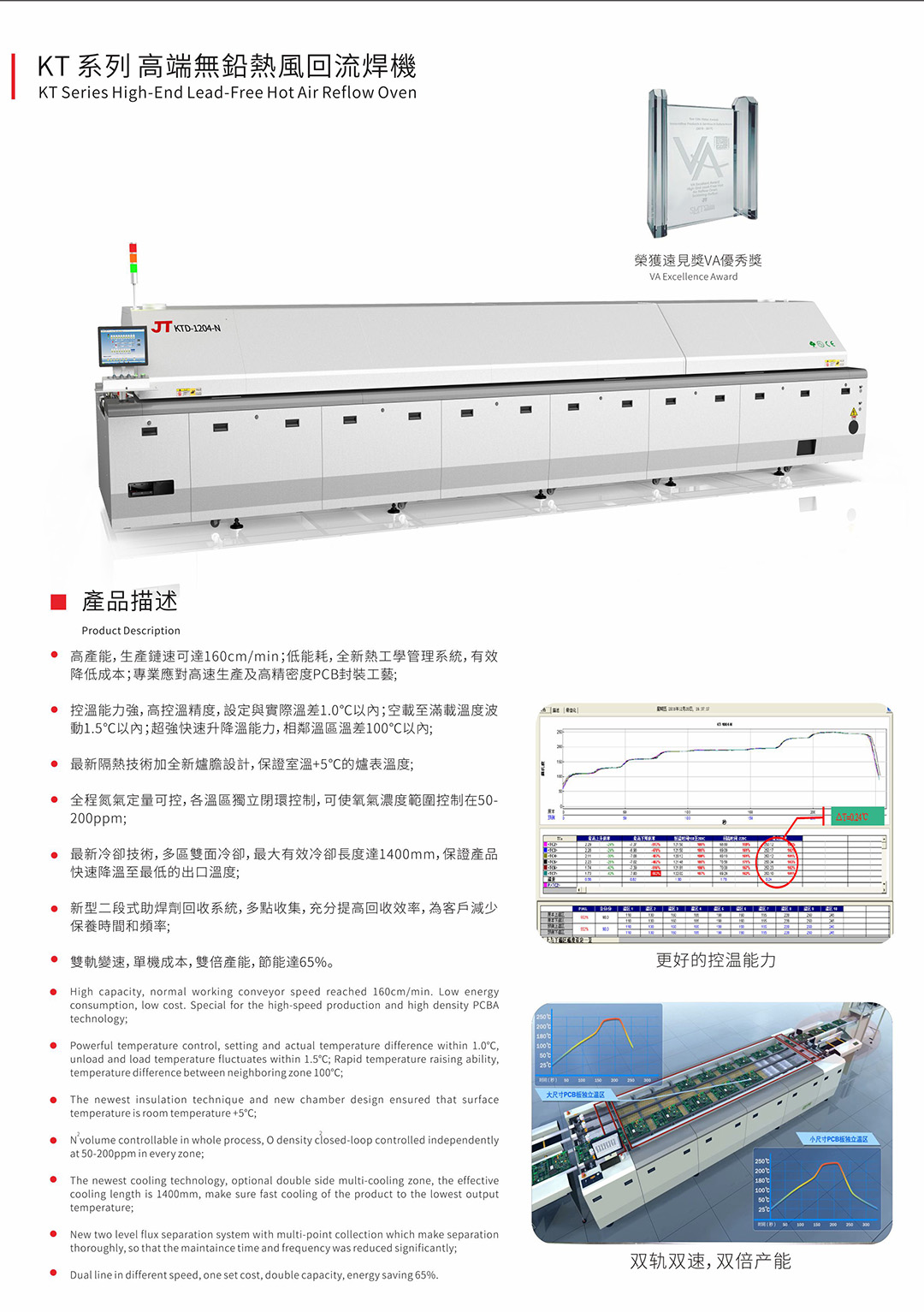 高產(chǎn)能,正常生產(chǎn)鏈速可達(dá)160cm/min;低能耗,全新熱工學(xué)管理系統(tǒng),有效降低成本.專業(yè)應(yīng)對(duì)高速生產(chǎn)及高精密度PCB封裝工藝.控溫能力強(qiáng),高控溫精度,設(shè)定與實(shí)際溫差1.0℃以內(nèi);空載至滿載溫度波動(dòng)1.5℃;超強(qiáng)快速升降溫能力,相鄰溫區(qū)溫差100℃以內(nèi).隔熱技術(shù)加全新?tīng)t膽設(shè)計(jì)保室溫+5℃左右的爐表溫度.全程氮?dú)舛靠煽兀鳒貐^(qū)獨(dú)…