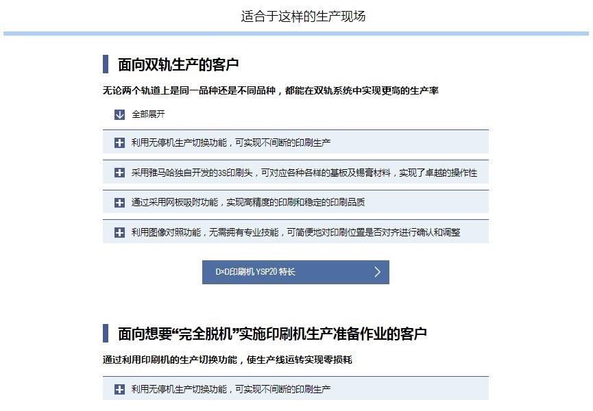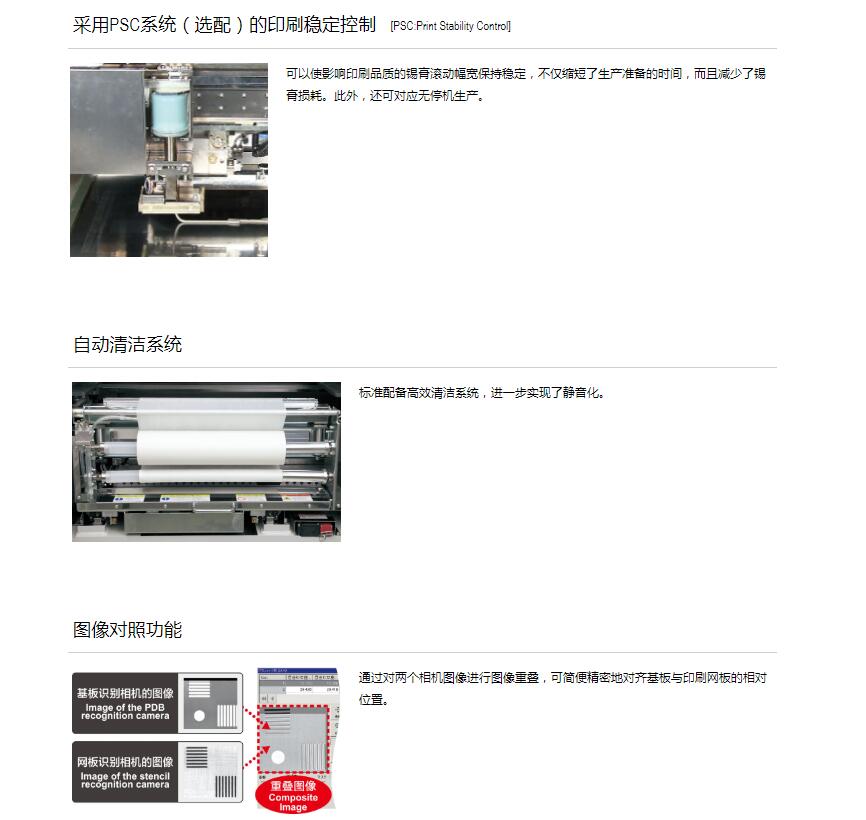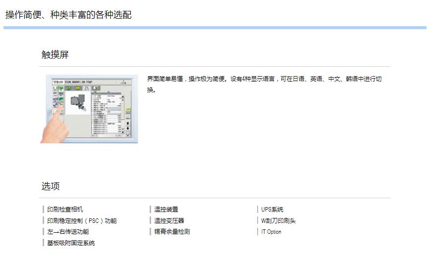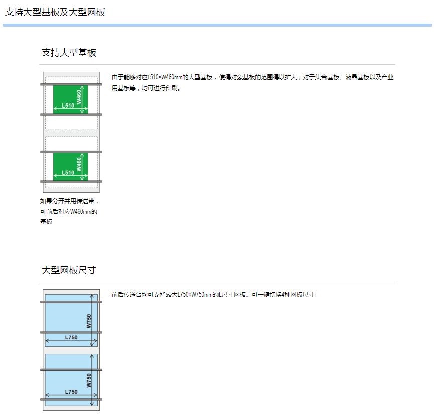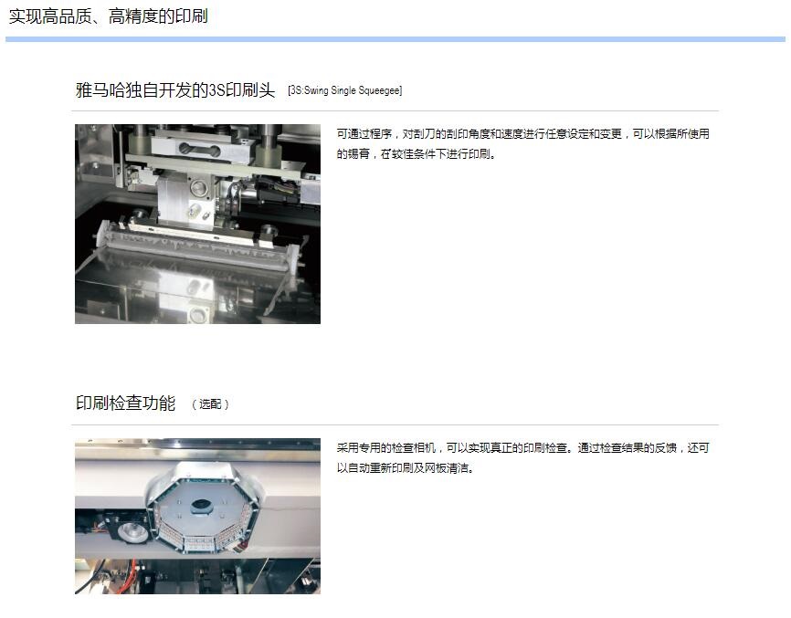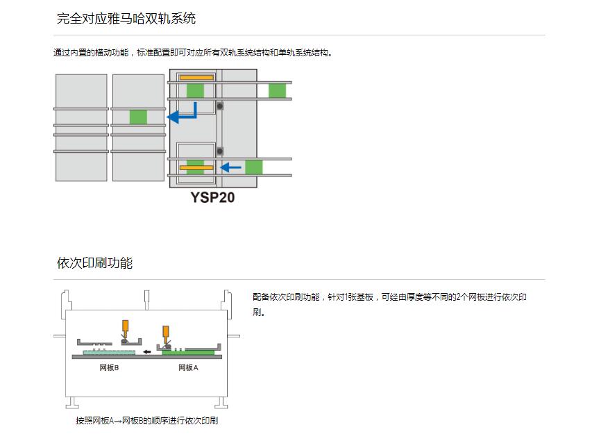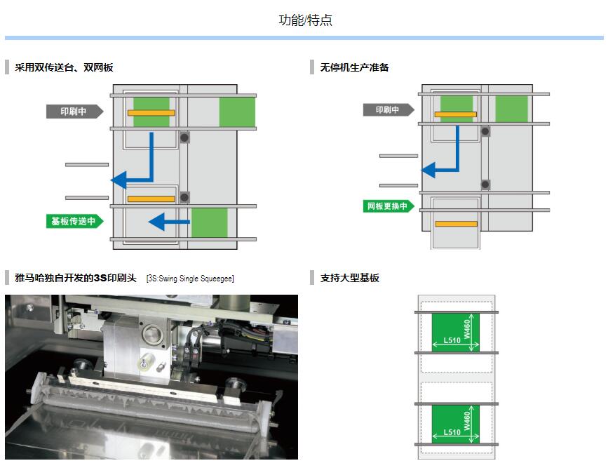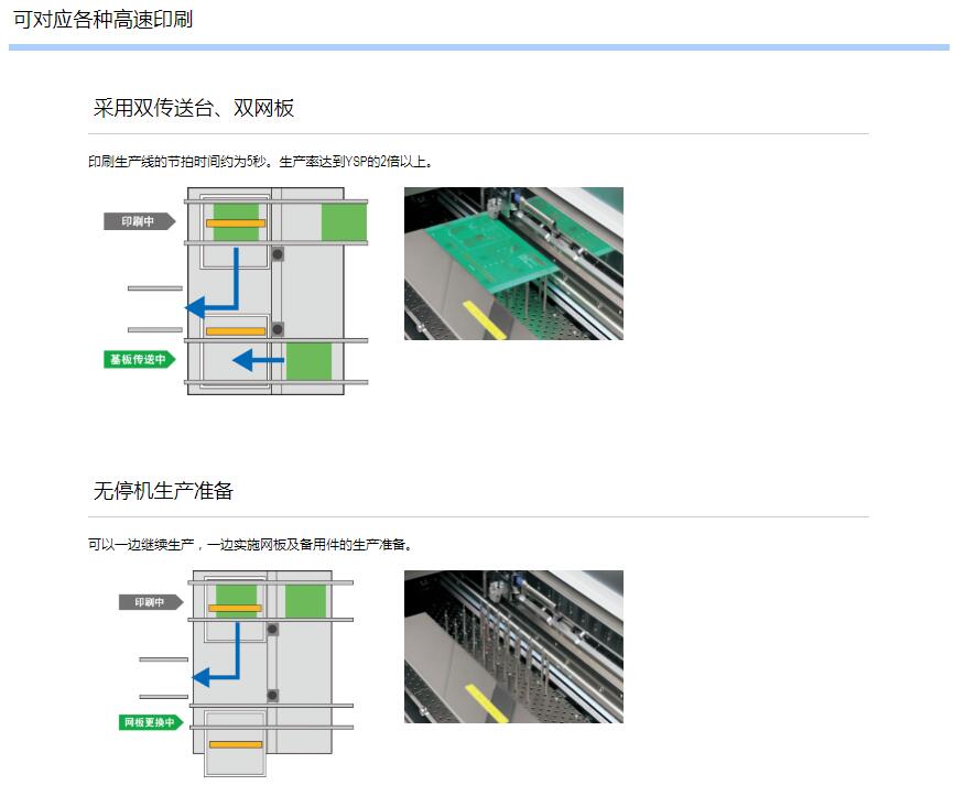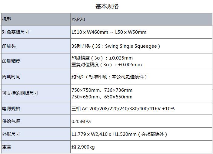 YSP20印刷機1.采用Dual stage、Dual mask。2.實現(xiàn)了超?!案咚佟薄ⅰ岸喙δ苄浴薄?.超高速印刷性能5sec/cycle。4.重復(fù)對位精度3σ:±0.005mm。5.支持大型基板L510 x W460mm。6.前后網(wǎng)板尺寸更大可達(dá)750×750mm。